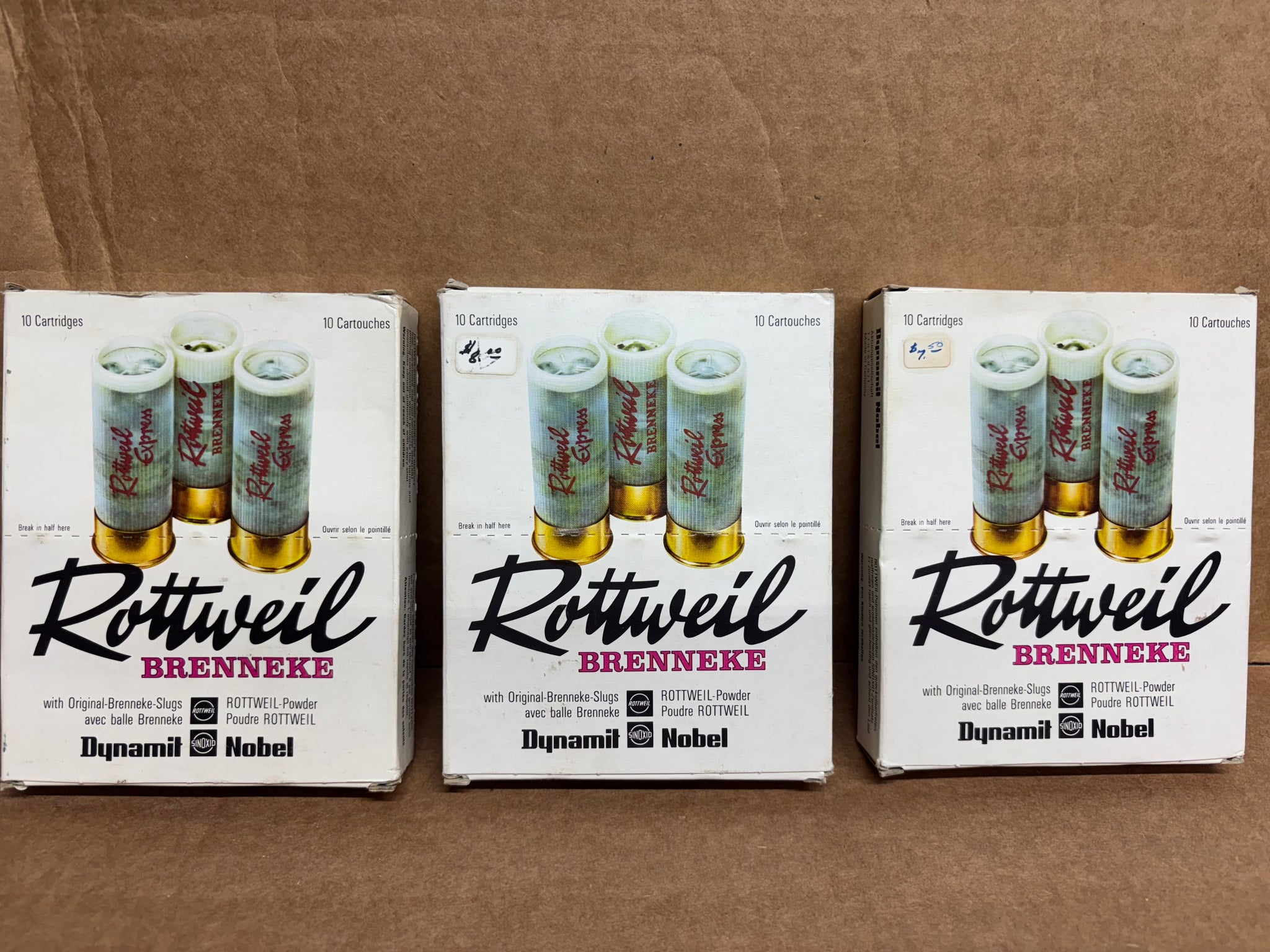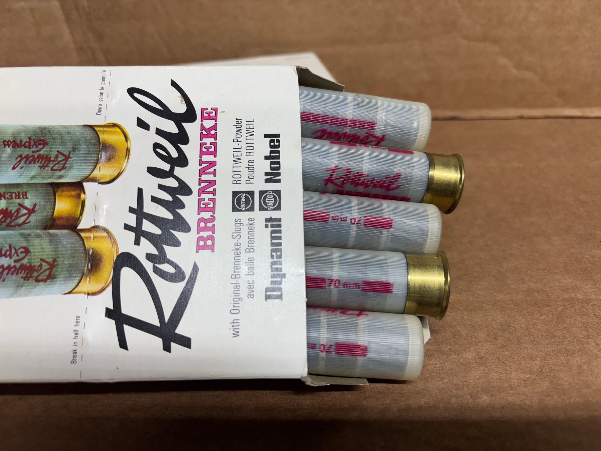 This is a box of 10 12 Gauge 2 3/4 Rottweil-Original Brenneke Slugs