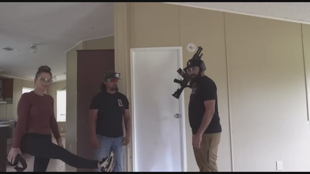 The Johnson Breaching round was made to address specific shortcomings with traditional door breaching rounds. This low cost highly effective device is a frangible projectile made of environmentally friendly steel dust and a ceramic binder, which turns to dust upon impact. The door-breaching cartridge produces an effective means of removing locks and hinges from metal or wooden doors constructed of materials up to 16-gauge steel. The projectile weighs 350 grains and has a muzzle velocity of 1,350 fps which yields about 1,400 foot pounds of energy which is more than enough horsepower for virtually all residential doors.