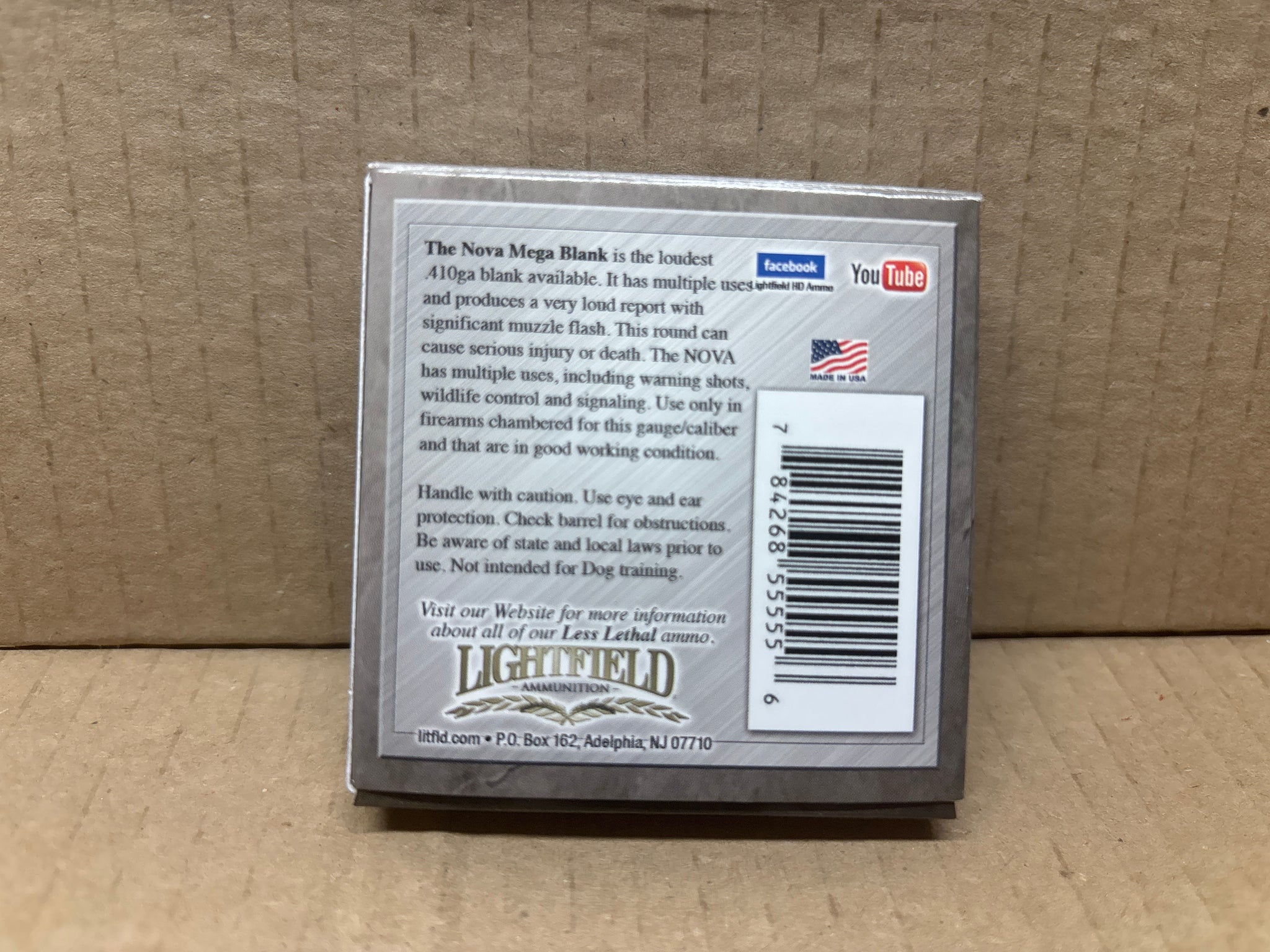 The Nova Mega Blank is the loudest 410ga blank available. It has multiple uses and produces a very loud report with significant muzzle flash. This round can cause serious injury or death. The NOVA has multiple uses, including warning shots, wildlife control and signaling. Use only in firearms chambered for this gauge/caliber and that are in good working condition.