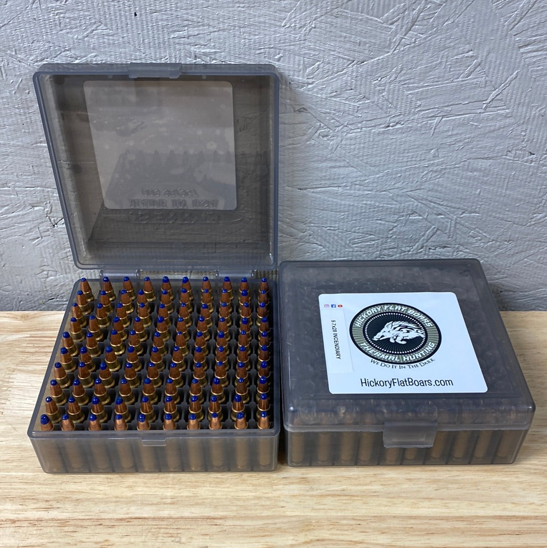 Custom 5.7x28 Incendiary Ammo. This ammo comes in a 6 round pack, a 20 round box and a 100 round plastic reusable box. These bullets produce a bright flash with sparks when striking a hard surface.