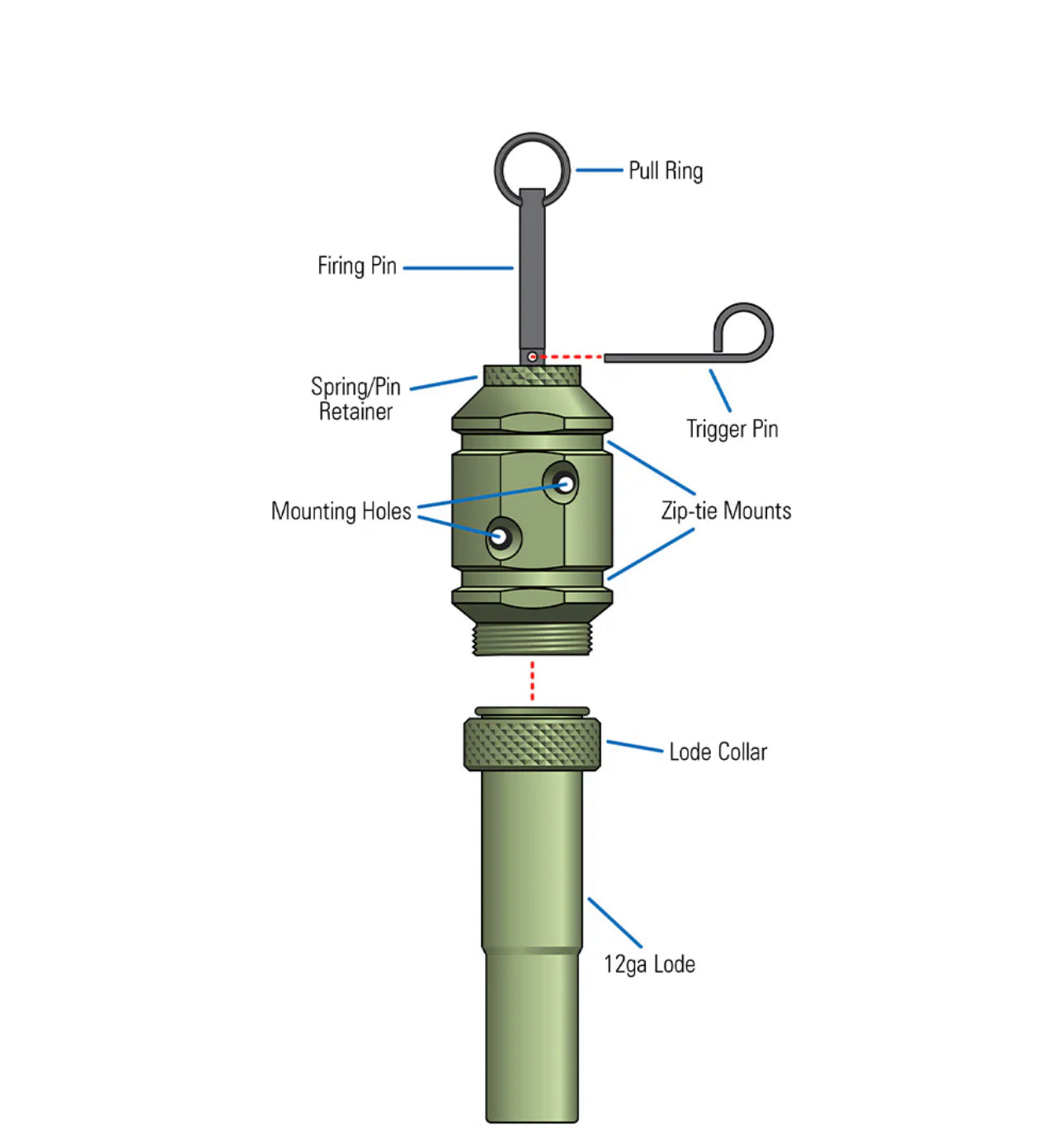 Our newest, updated version of our 12 gauge perimeter trip alarm. Made of 6061 Aluminum, this unit utilizes a spring-loaded firing mechanism and a trip trigger. When the trigger pin is disturbed while loaded with a 12 gauge Orion rounds, the unit will discharge. This device is compatible with Orion blanks, .22 cal & 209 adapters, Orion 12 ga. flares and Orion Pest Scare.