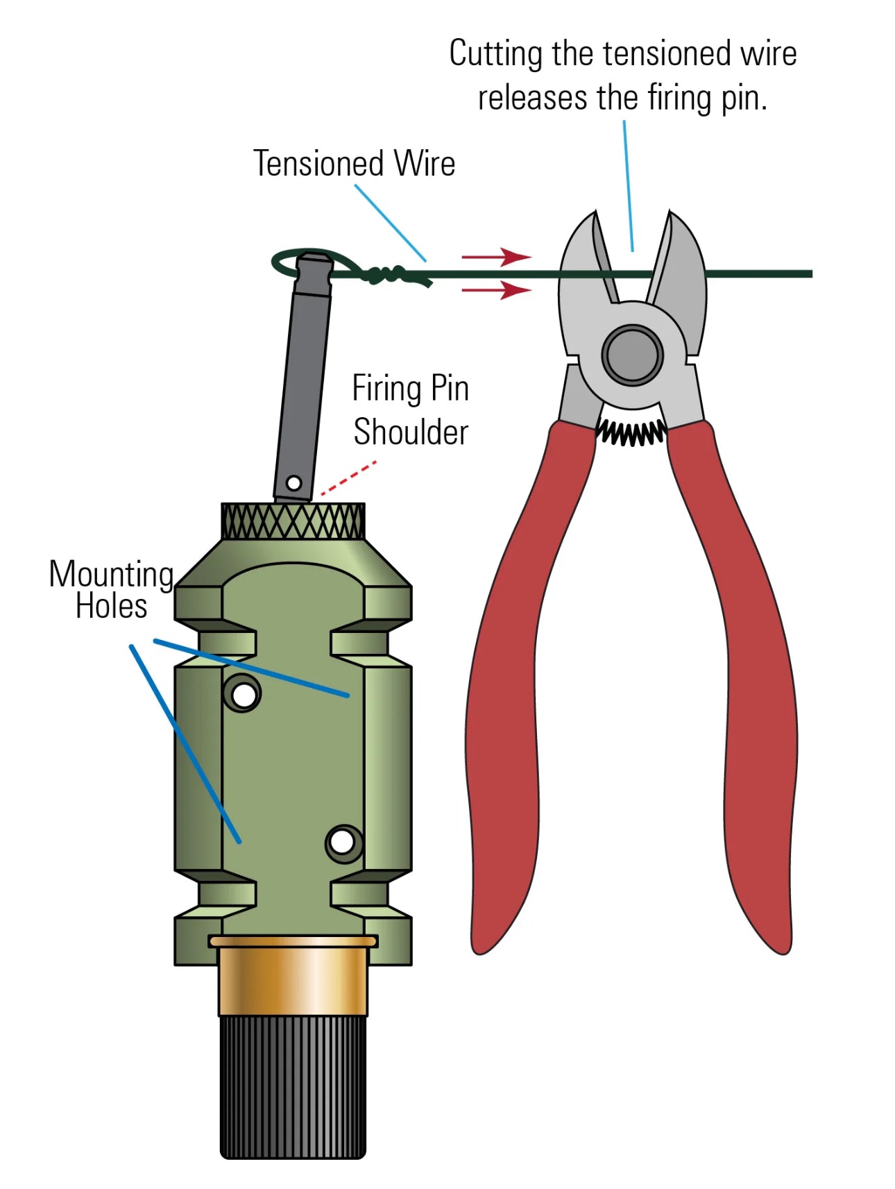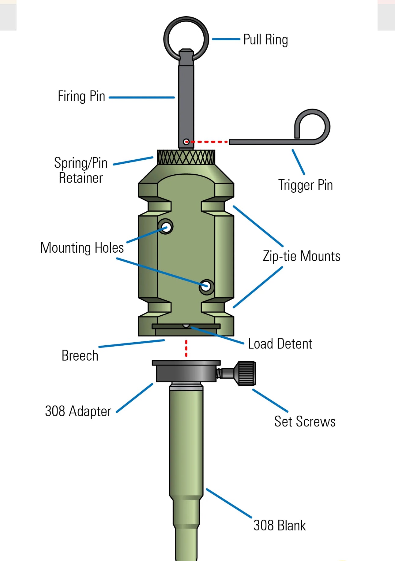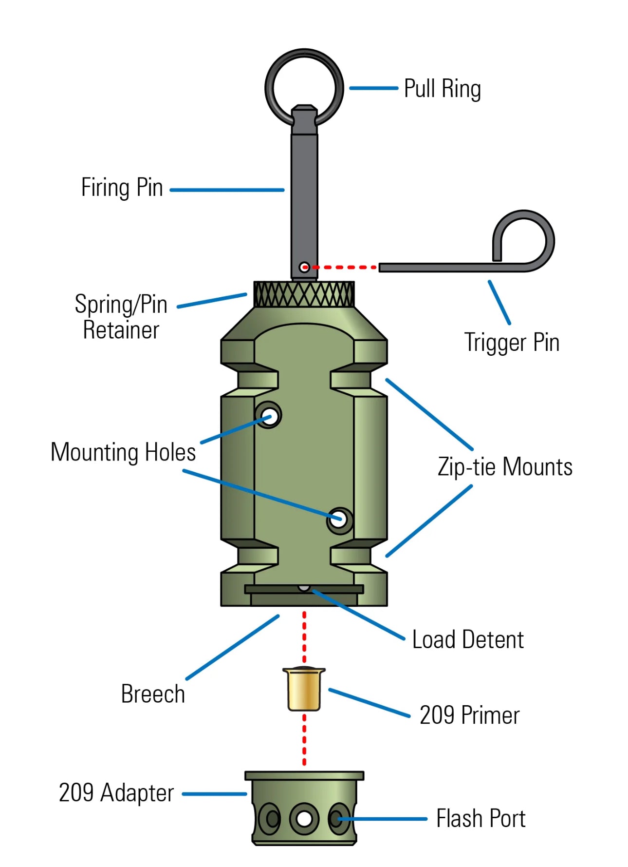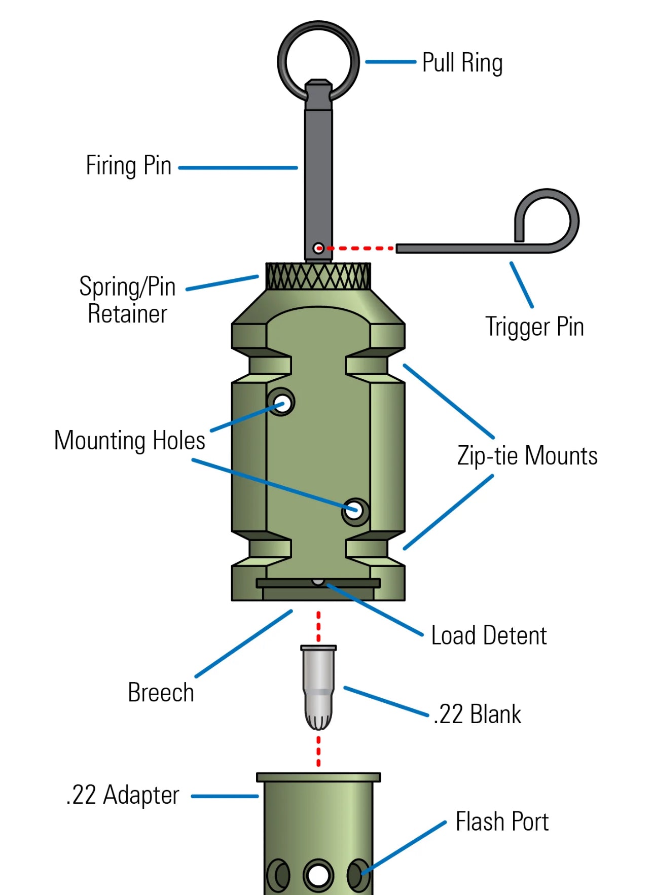 The FithOps perimeter trip alarm is made of 6061 Aluminum, the unit utilizes a spring loaded firing mechanism and a trip trigger. When the trigger is disturbed while loaded the unit will discharge. This kit comes with the 12g device and three FithOps adapters.