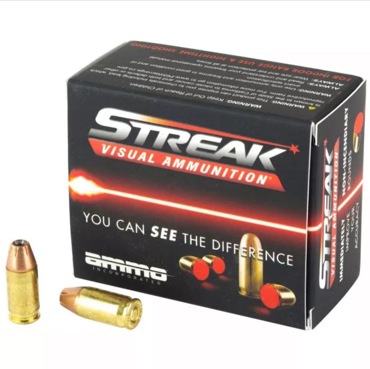Streak's exclusive patented technology allows the shooter to visually see the projectile's path towards its target. Streak rounds are non-incendiary, they do not generate heat so they are safe to use in environments. The results are game changing in many aspects for the consumer, law enforcement, and military. For indoor range use and night time shooting.