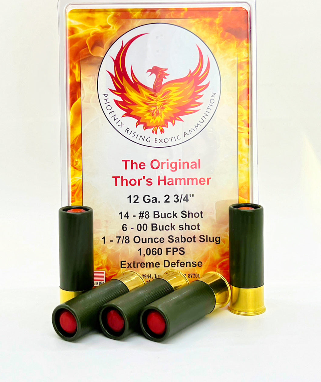 Here is the legendary 12 gauge Phoenix Rising "The Original Thor's Hammer". This round is loaded with 14 - #4 buck shot, 6 - 00 buck shot, and a 7/8 ounce FSJ slug. Truly fit for a king's defense, this heavy hitter represents the long standing quality you have come to expect from Phoenix Rising.